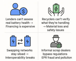 Today, most batteries are untraceable. There’s no shared way to verify where they came from, how they’ve been used, or when they were retired. That creates serious risk:
