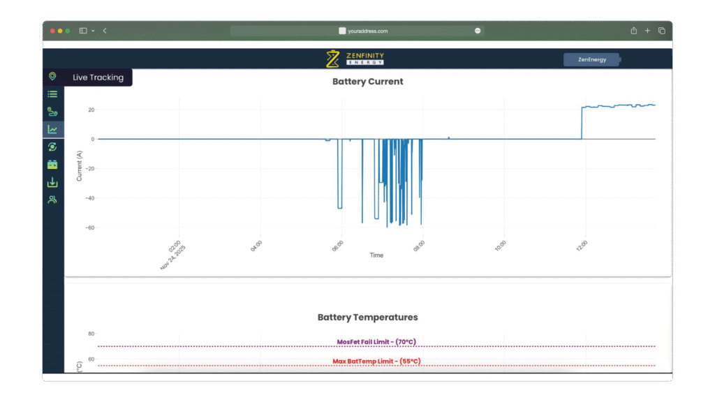 - Performance data: State of Health (SoH), usage cycles, temperature, alerts